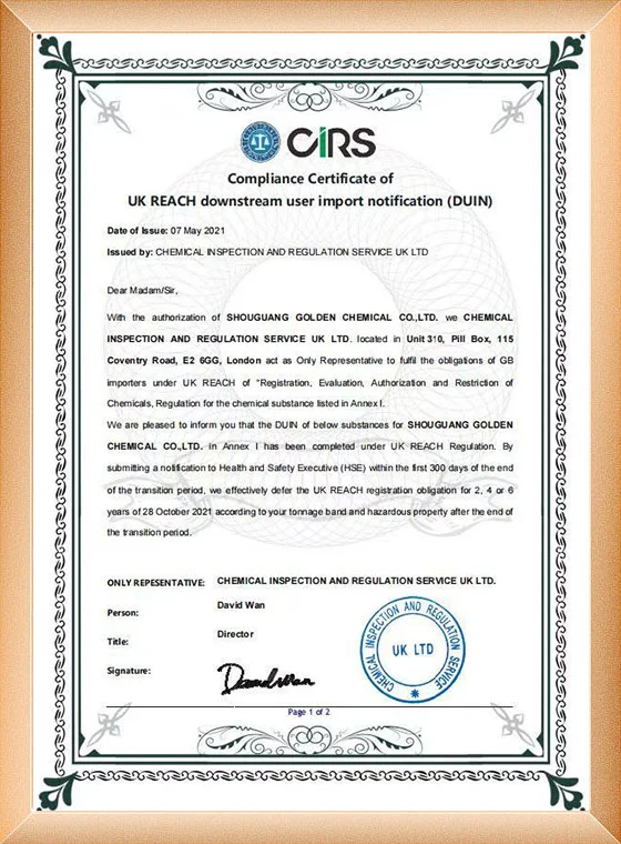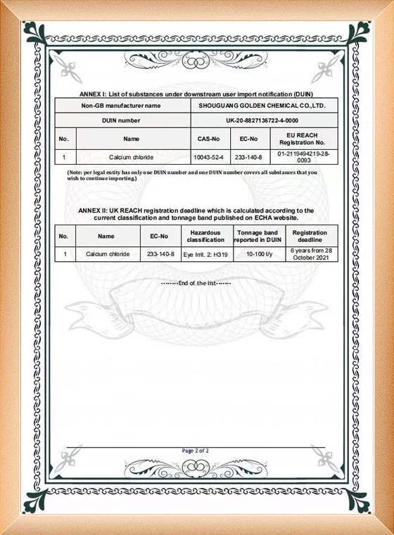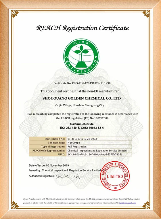เนื่องจากความต้องการแคลเซียมคลอไรด์ที่เพิ่มขึ้นจากลูกค้าในสหภาพยุโรป และด้วยทัศนคติในการให้บริการคุณภาพสูงแก่ลูกค้า บริษัทของเราจึงได้สมัครและได้รับใบรับรอง REACH ในปี 2019