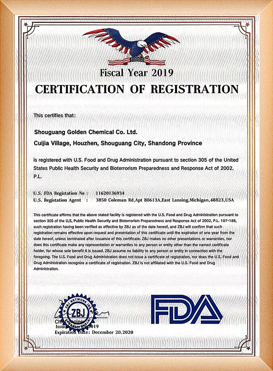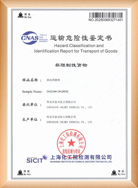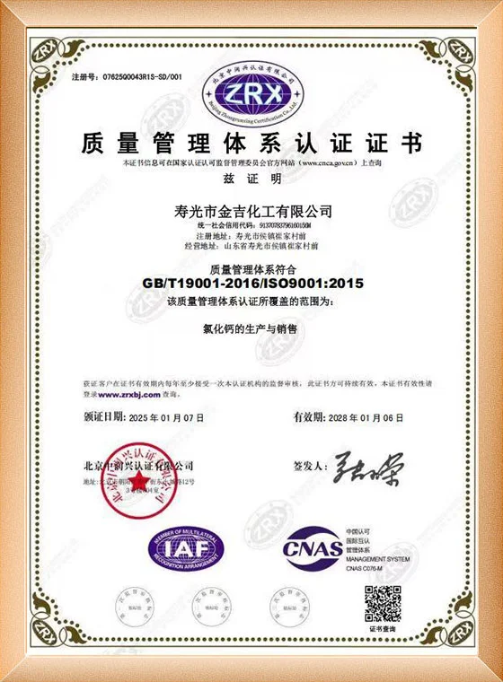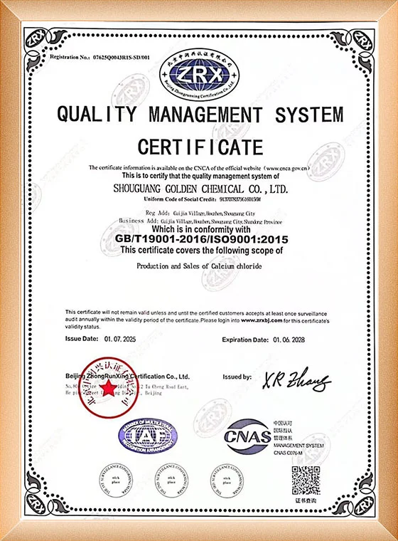 ในปี 2015 การจัดการคุณภาพของผลิตภัณฑ์แคลเซียมคลอไรด์ผ่านการรับรองระบบการจัดการคุณภาพ ISO9001-2008 และในปี 2019 ได้รับใบรับรอง EU REACH